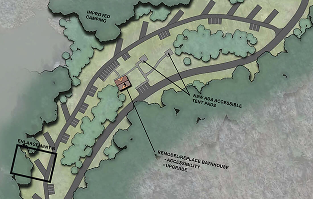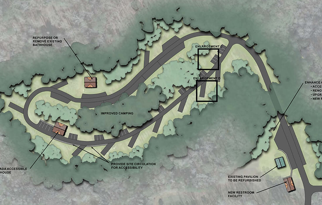 camping and day-use facilities while clearly distinguishing between the two functions. Through a comprehensive site assessment, we identified opportunities to enhance both developed and undeveloped areas, improving the park’s key attributes and overall appeal. The plan set clear goals to better serve target user groups, proposing updates to facilities, furnishings, and amenities to increase accessibility and enjoyment.