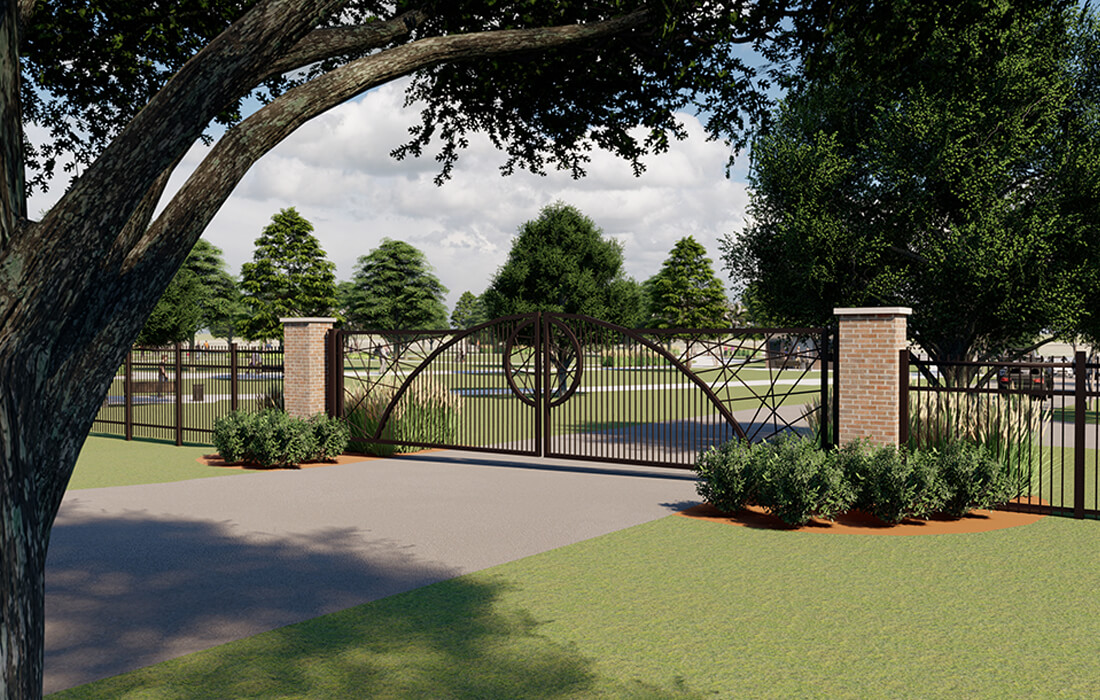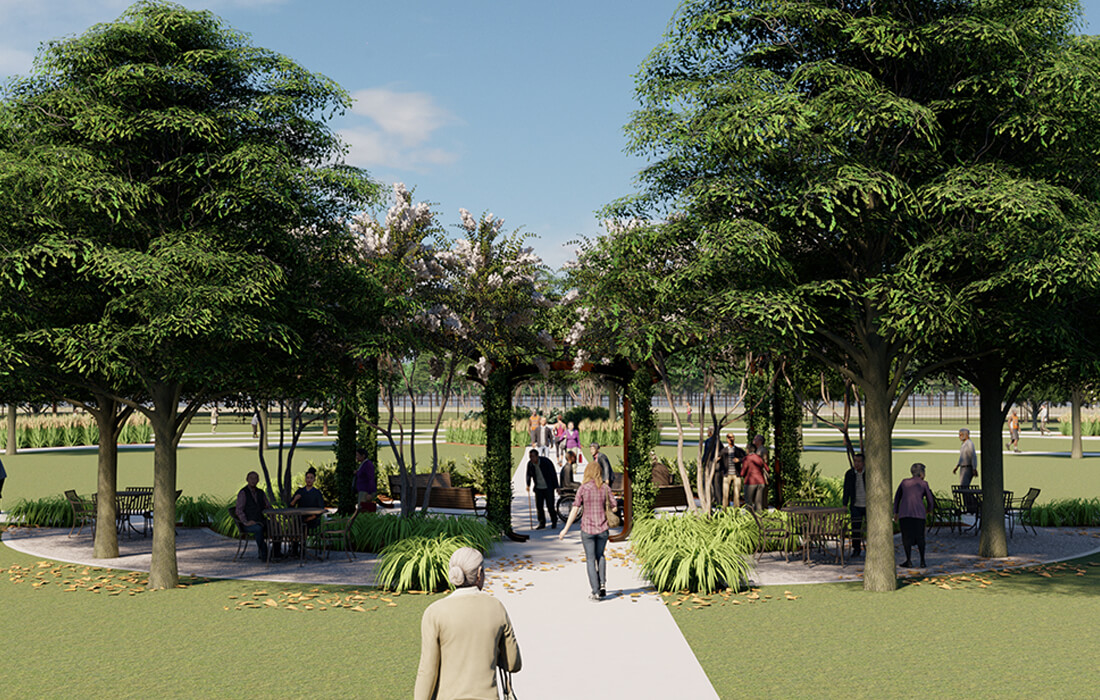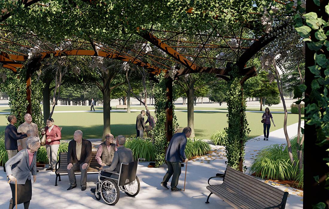 Nursing Home Board’s vision for the park and making it a reality by further developing the design, producing construction documentation, and taking the project through construction. The park features circular walking trails, a steel pergola, vehicular gate access, restroom facilities, parking lot improvements, and planting irrigation and lighting design.