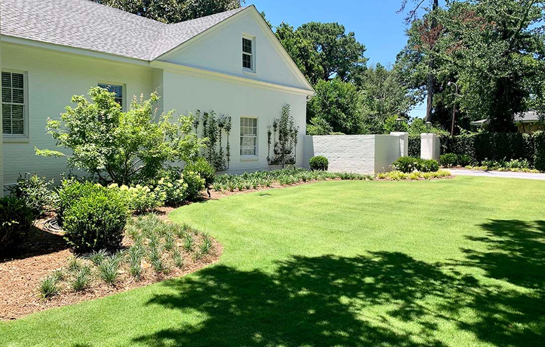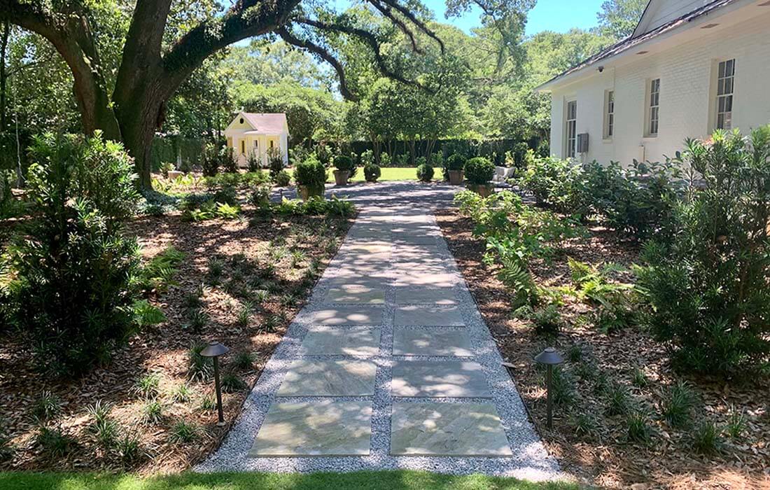 WAS Design was enlisted to master plan and detail-design this property in Mobile, AL. Sandstone pathways connect the great lawn, private patio in the shade garden to the pool area. Close attention to details like a private motor court and landscape lighting give this home great curb appeal.